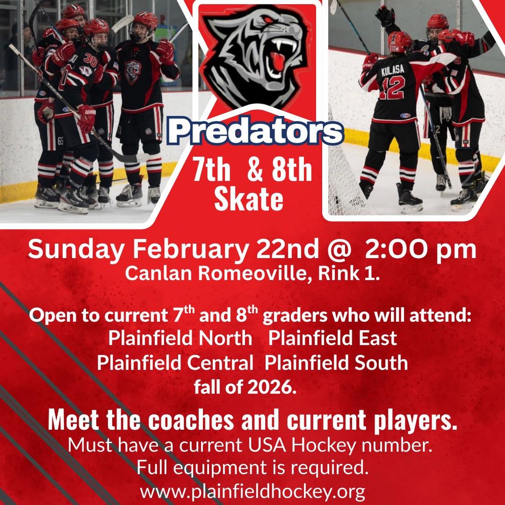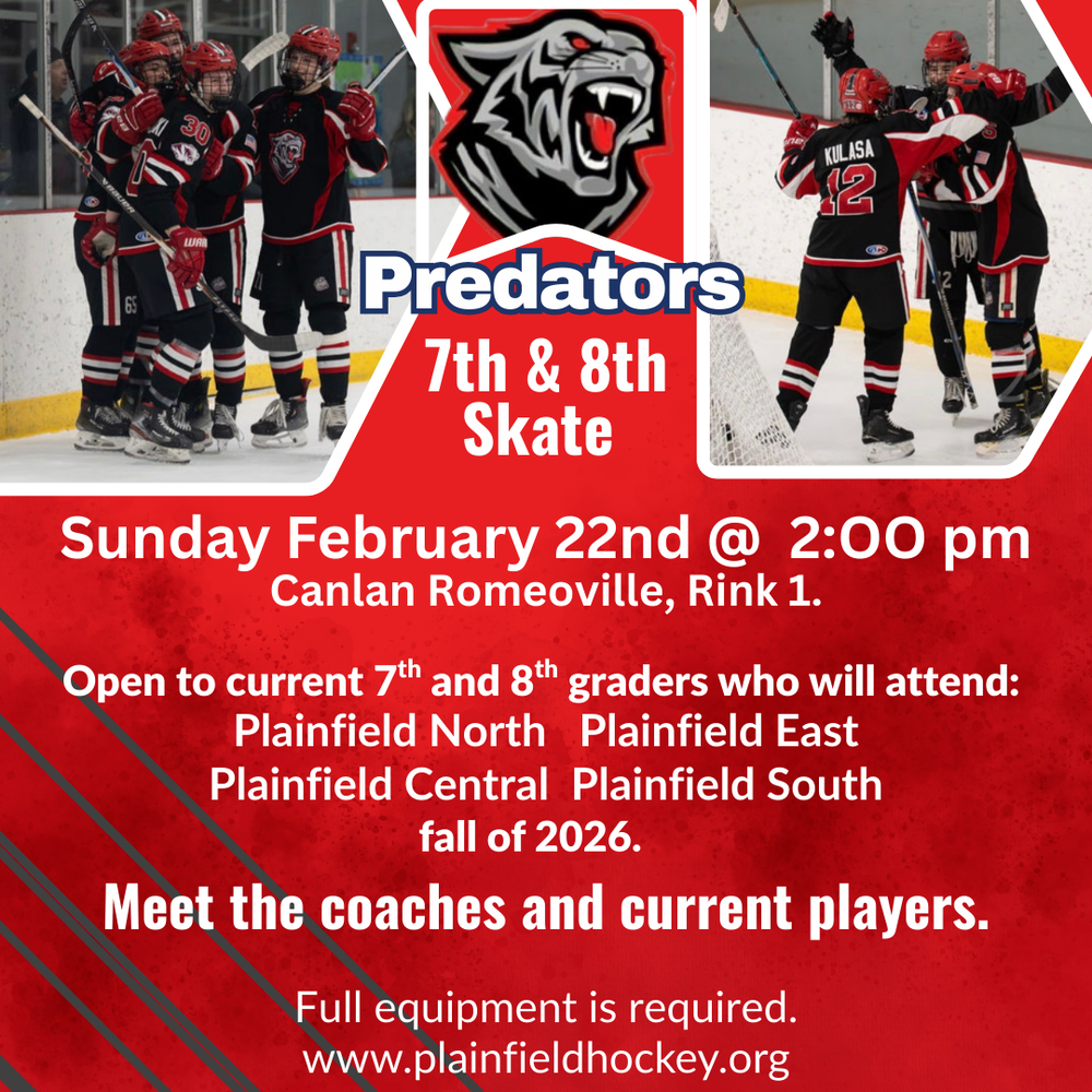 Plainfield Predator High School Hockey club will host it's annual free 7th & 8th Grade Open Skate on Sunday February 22nd @ 2:00 pm at Canlan.
